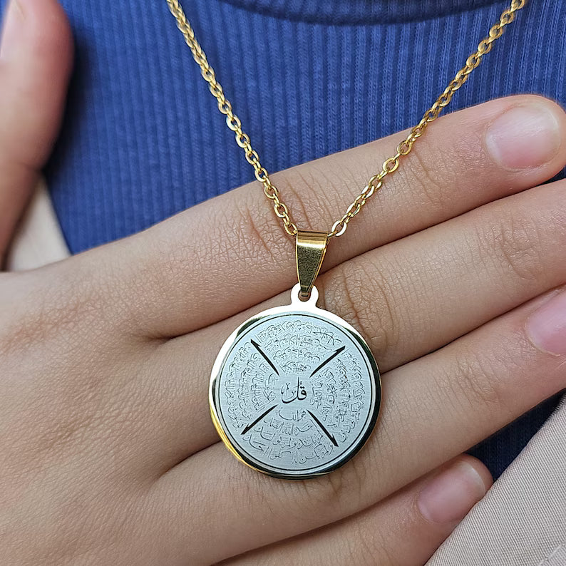 This beautifully crafted necklace features the first sentence of Ayat al-Kursi (Verse 255 of Surat al-Baqara) in elegant Arabic calligraphy. The inscription reads: "Allahu La ilaha illa Huwa al-Hayyul-Qayyum," meaning, "There is no god but Allah. He is the Ever-Living, the Sustainer of all existence. He neither slumbers nor sleeps."